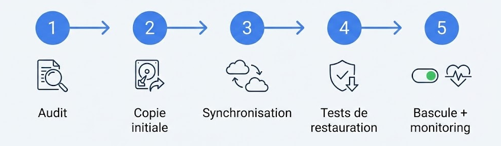 L’intérêt d’une alternative s3 est de limiter l’impact : si les usages restent compatibles, la migration se pilote surtout par endpoint et accès. Pour Leviia Storag3, une trajectoire réaliste suit 5 étapes : audit → copie initiale → synchronisation → tests de restauration → bascule.