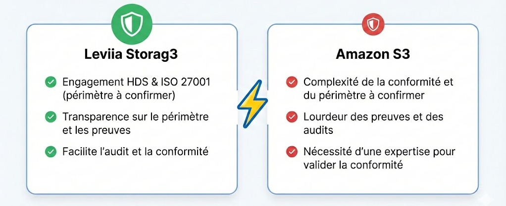 Côté Amazon S3, la conformité est atteignable, mais elle repose davantage sur le cadrage : responsabilités partagées, preuves, procédures, logs. En clair : AWS peut convenir, mais le “travail de conformité” est souvent plus dépendant de l’organisation interne, alors qu’avec Leviia l’intention est de réduire ce coût de cadrage.