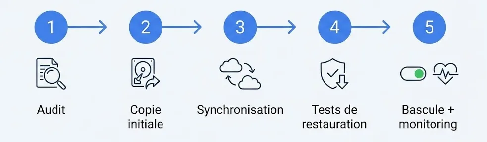 L’intérêt d’une alternative s3 est de limiter l’impact : si les usages restent compatibles, la migration se pilote surtout par endpoint et accès. Pour Leviia Storag3, une trajectoire réaliste suit 5 étapes : audit → copie initiale → synchronisation → tests de restauration → bascule.