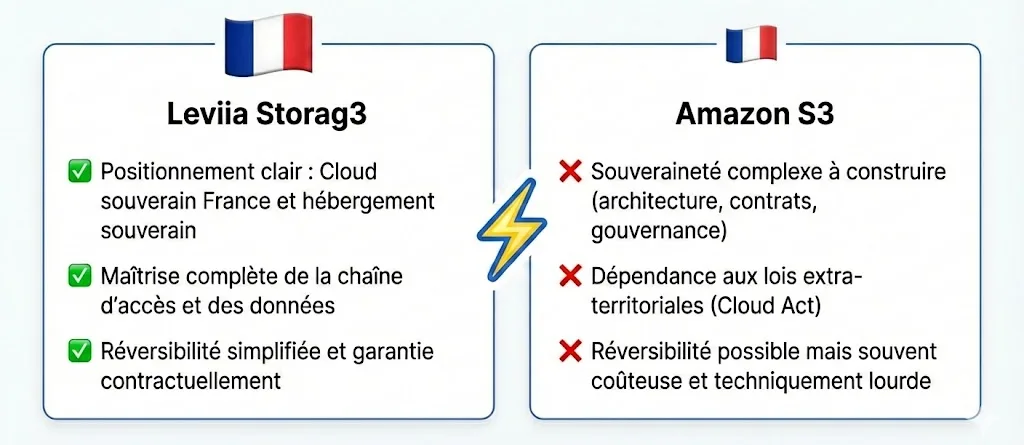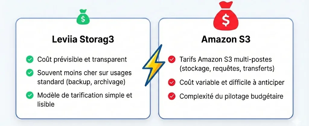 | Critère | Leviia Storag3 | Amazon S3 |