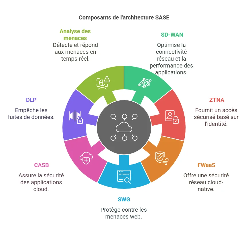 L’architecture SASE repose sur plusieurs composants essentiels, chacun jouant un rôle clé pour atteindre les objectifs de sécurité et d’optimisation réseau. Voici les principaux éléments :