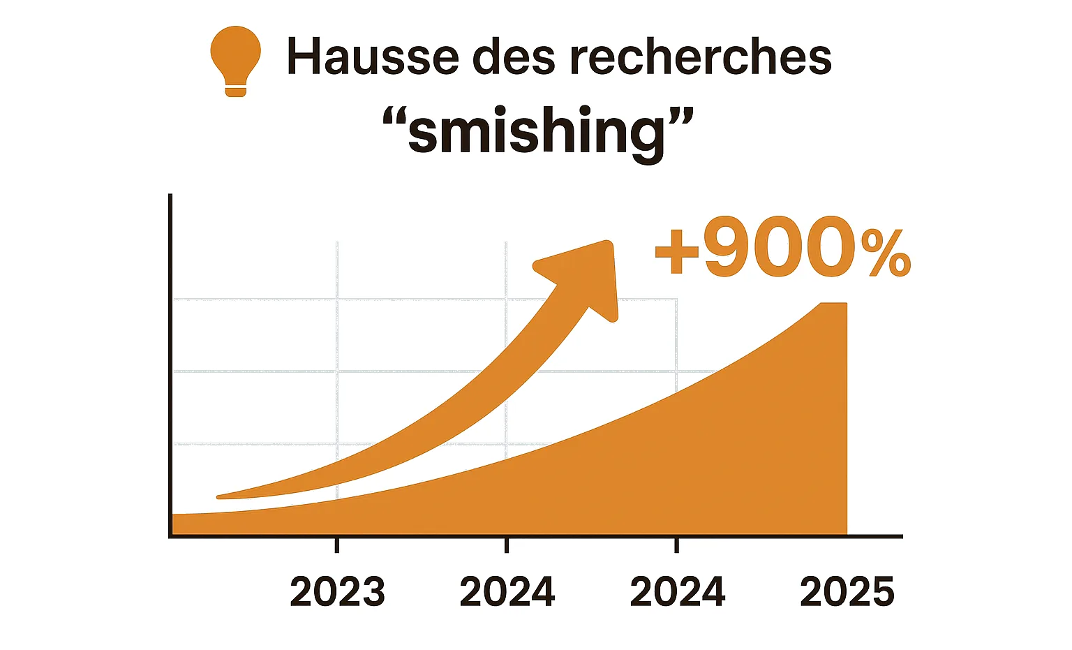 💡 Idée illustration : une infographie en ouverture montrant la hausse de +900 % des recherches “smishing” entre 2022 et 2025.